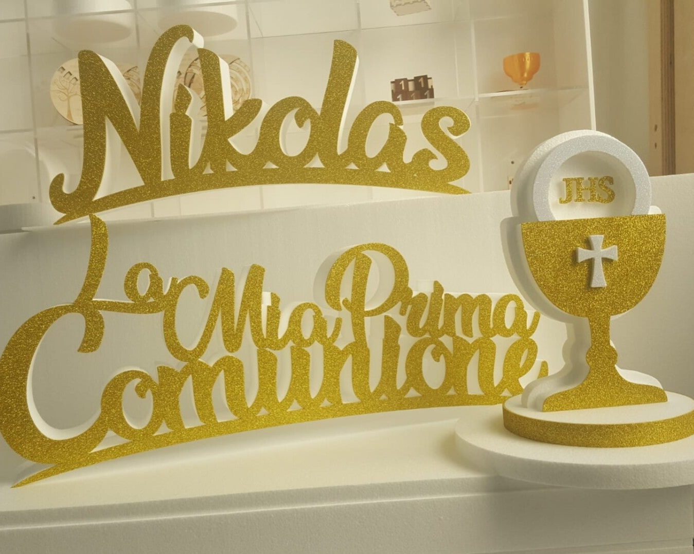 allestimento in polistirolo con glitter frontale personalizzabile nel colore
